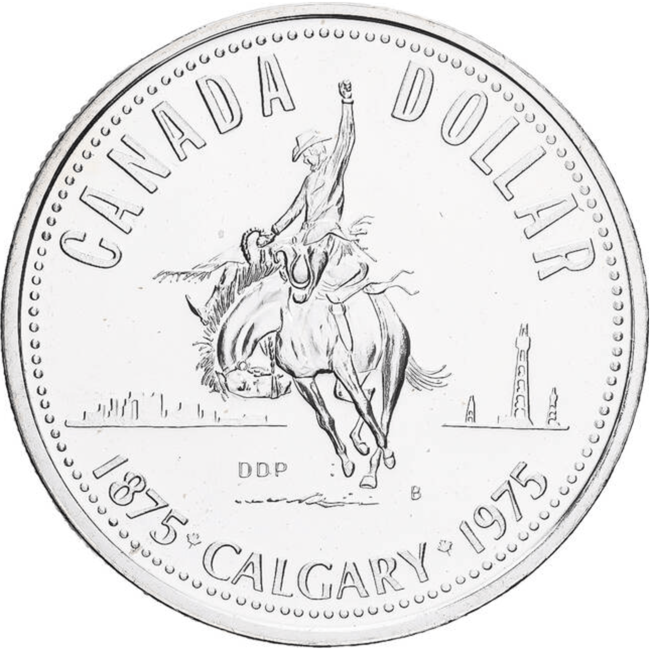 Pays : Canada Poids brut : 23,32 g Poids fin : 11,66 g Titre : 500/1000 Diamètre : 36 mm Valeur faciale : 1$ CAD 100e anniversaire de la ville de Calgary