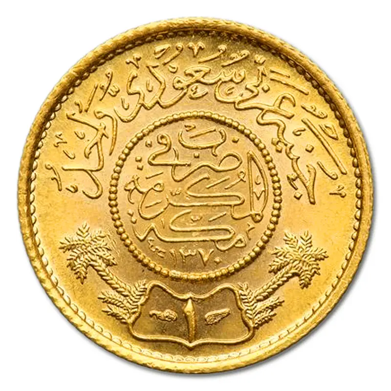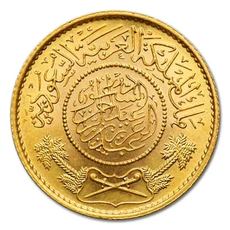 Pays : Arabie Saoudite Poids brut : 7,99 g Poids fin : 7,32 g Titre : 916,7/1000 Ø : 22 mm Epaisseur : 1,5 mm Valeur faciale : 1 gunayh Dirigeant : Abdelaziz Pièce nettoyée