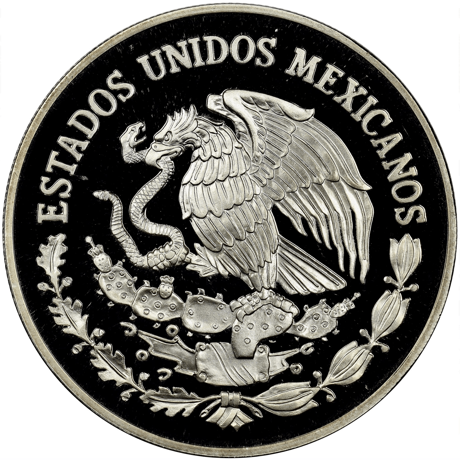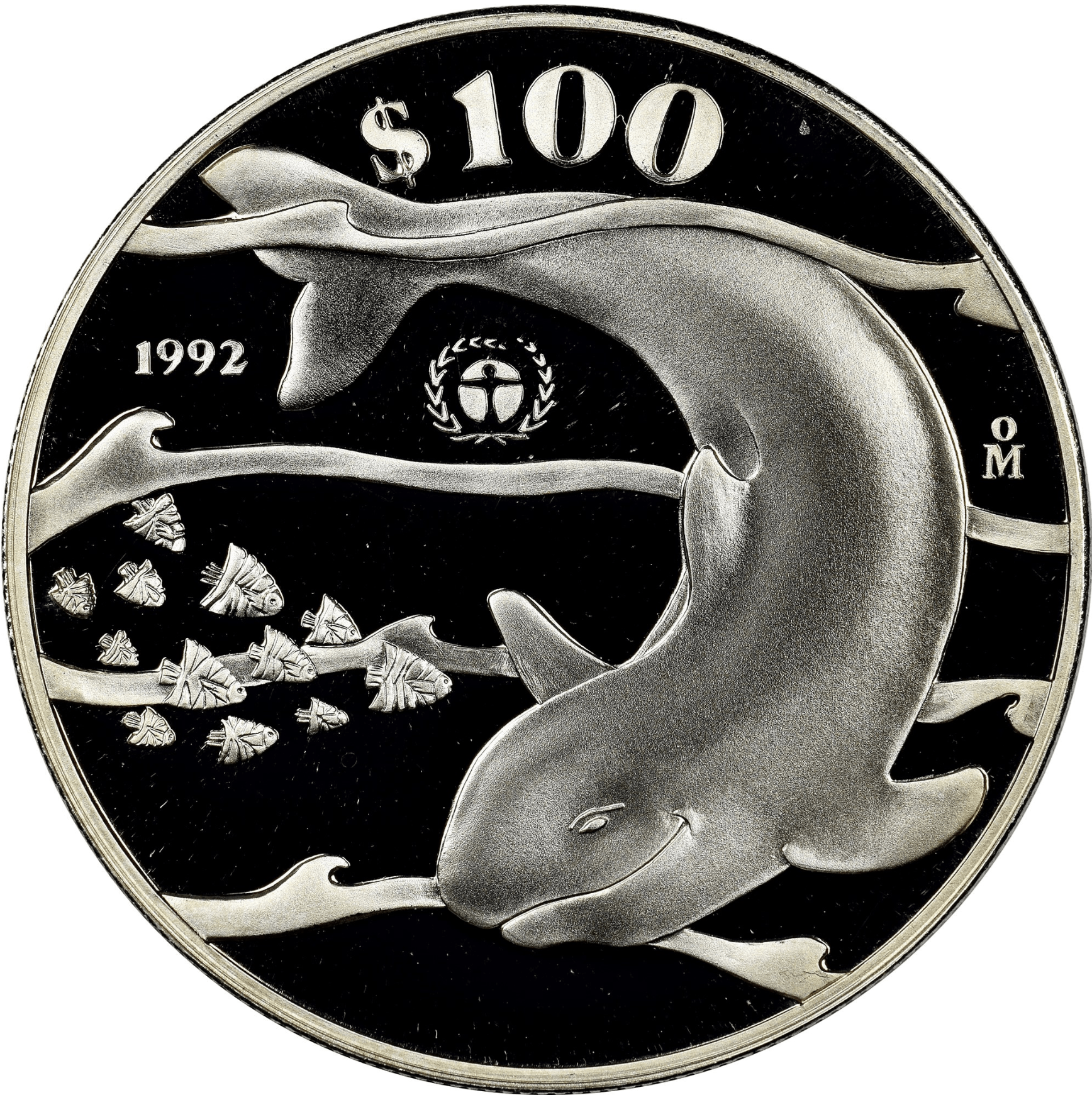 Métal : argent Année 1992 28 007 exemplaires Pays : Mexique Emetteur : Banco de Mexico Poids brut : 31,10 g Poids fin : 31,10 g Titre : 999/1000 Diamètre : 40 mm Valeur faciale : 100$ Sauver le vaquita