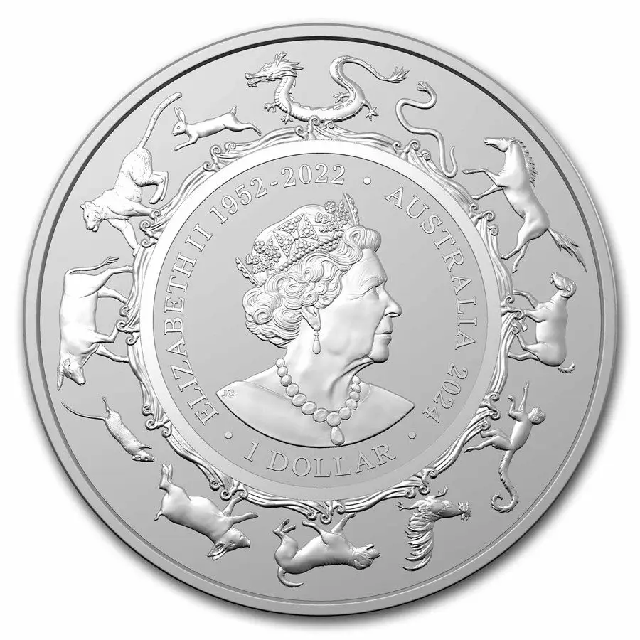 Année : 2024 Pièce sous capsule 50 000 exemplaires Pays : Australie Fabricant : Royal Australian Mint Poids brut : 31,1 g Poids fin : 31,1 g Titre : 999,9 Ø : 40 mm Valeur faciale : 1 $ AUD Drago