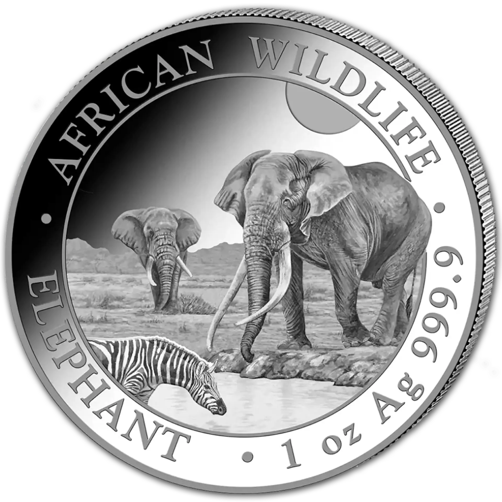 Poids brut : 31,10 g Poids fin : 31,10 g Titre : 999,9/1000 Ø : 39 mm Effigie : l’éléphant d’Afrique Valeur faciale : 100 shillings /20 : tube