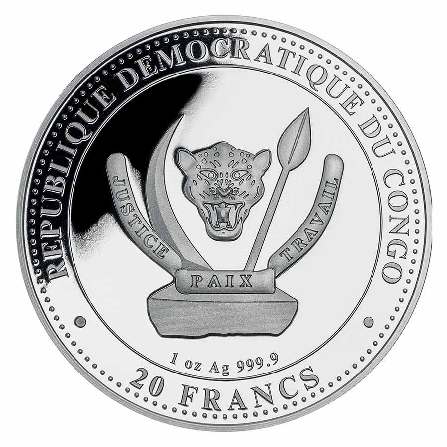Pays : Congo Poids brut : 31,1 g Poids fin : 31,1 g Titre : 999/1000 Ø : 38,6 mm
