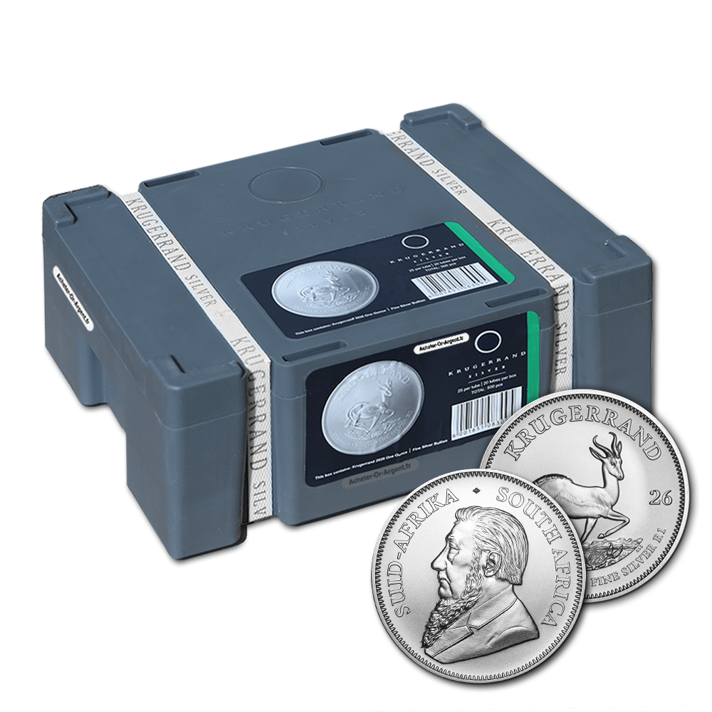 Métal : argent Année : 2026 Monster box de 500 pièces Pays : Afrique du Sud Emetteur : Rand Refinery Poids brut : 31,10 g Poids fin : 31,10 g Titre : 999/1000 Diamètre : 38,7 mm
