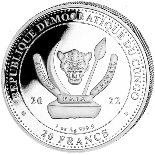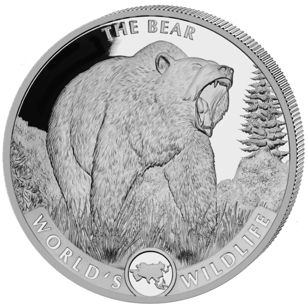 Pays : Congo Poids brut : 31,1 g Poids fin : 31,1 g Titre : 999,9/1000 Ø : 38,6 mm Valeur faciale : 20 Francs Série : World´s Wildlife (ours) Sous capsule plastique