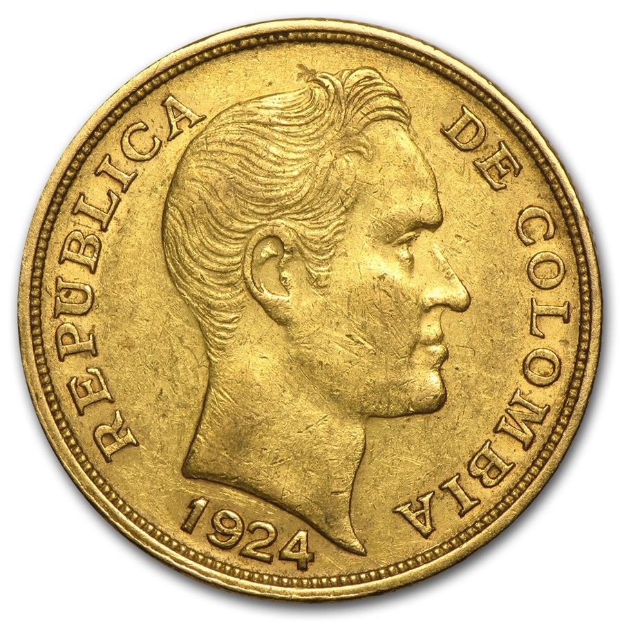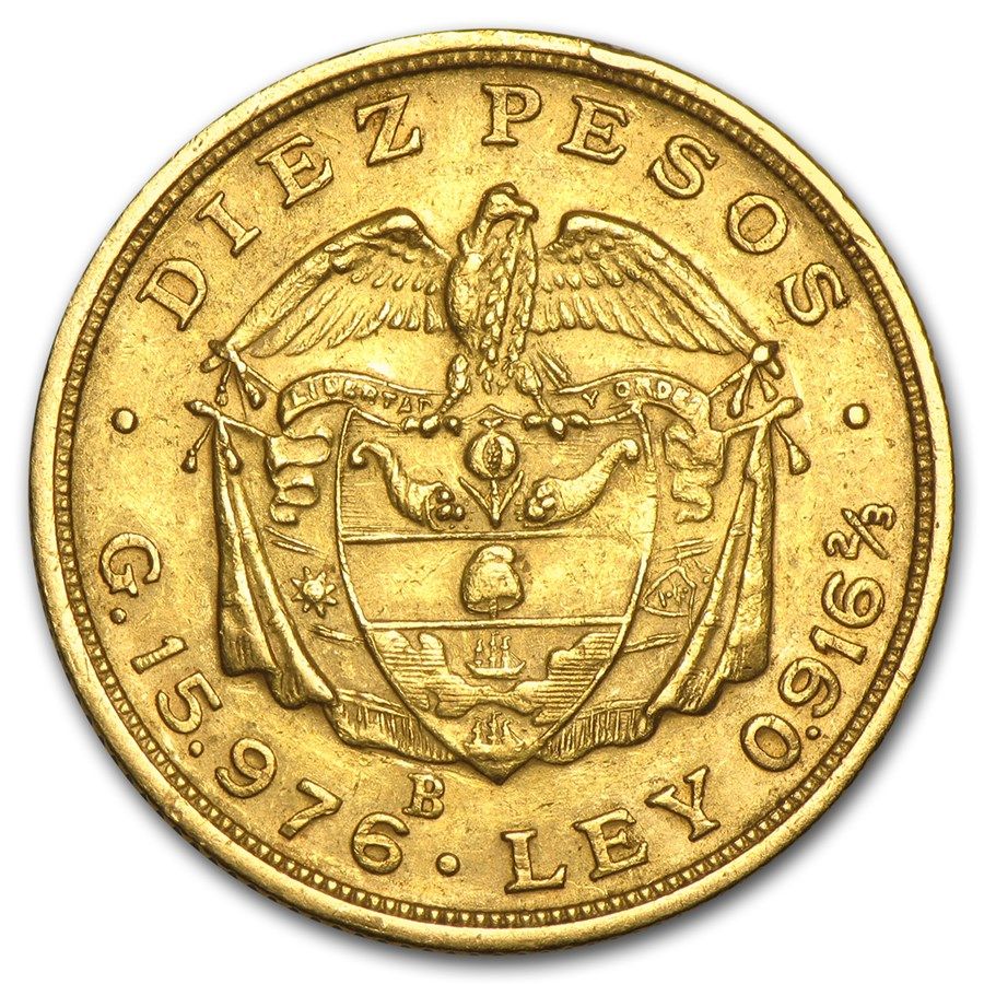 Pays : Colombie Poids brut : 15,97 g Poids fin : 14,64 g Titre : 916,7/1000 Diamètre : 26 mm Effigie : Buste Simón Bolívar, et armoirie de la République de Colombie Valeur faciale : 10 pesos