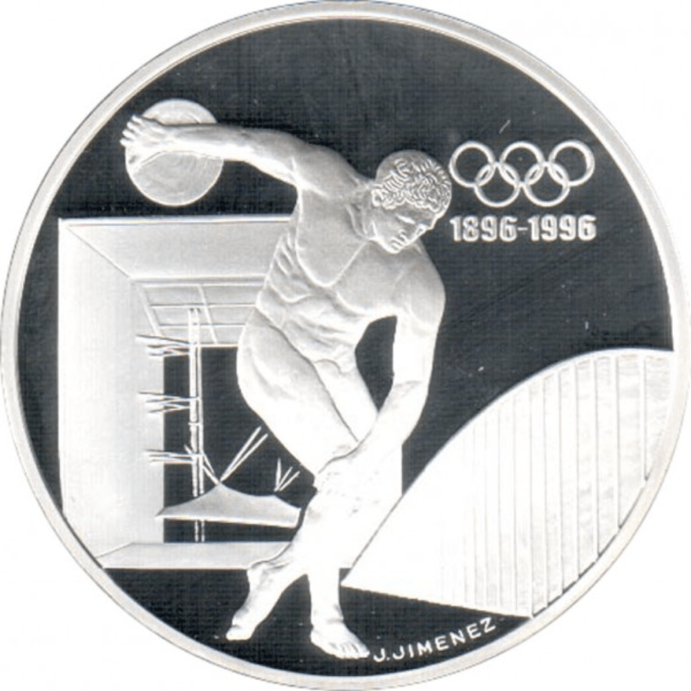 Année 1994 Emetteur : Monnaie de Paris Poids brut : 33,63 g Poids fin : 31,10 g Titre : 925/1000 Diamètre : 40 mm Valeur faciale : 100 francs Effigies : Disque, Jeux Olympiques de 1996, Atlanta