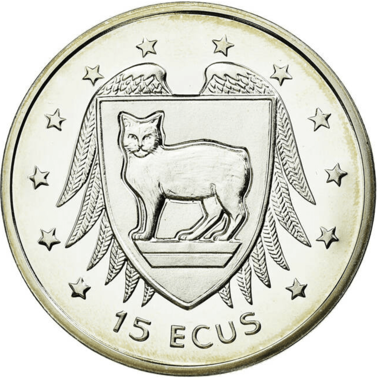 Métal : argent Année 1994 30 000 exemplaires Pays : Ile de Man Emetteur : Pobjoy Mint Poids brut : 10 g Poids fin : 9,25 g Titre : 925/1000 Diamètre : 30 mm Valeur faciale : 15 écus Chat manx dans un écu et avec des ailesT
