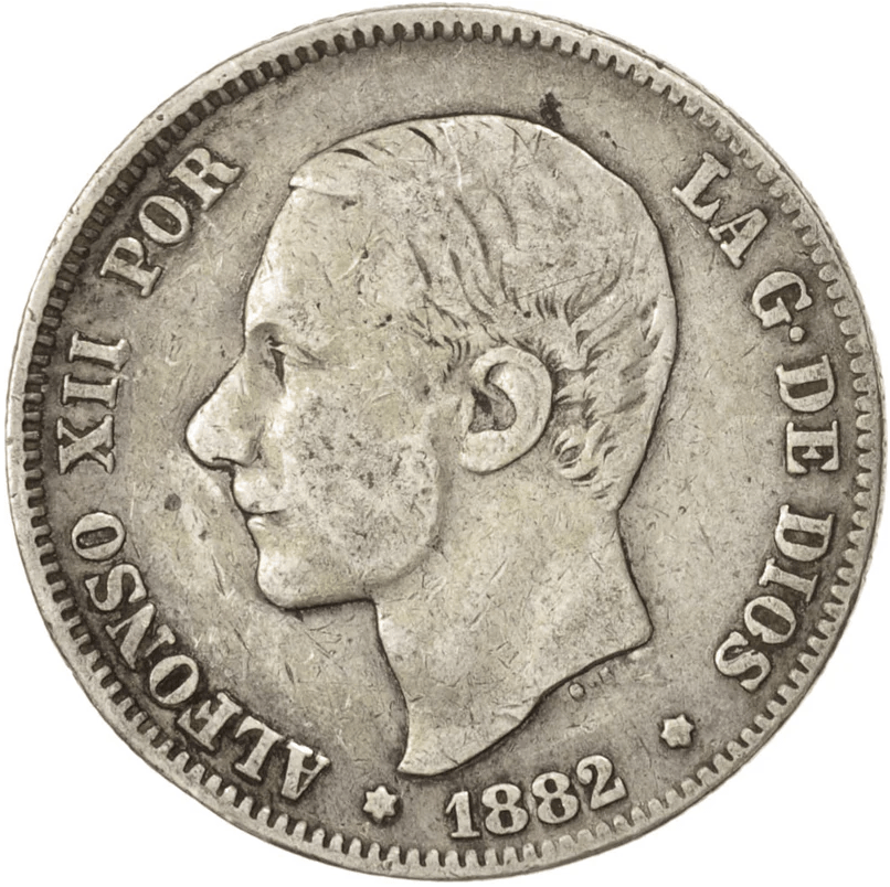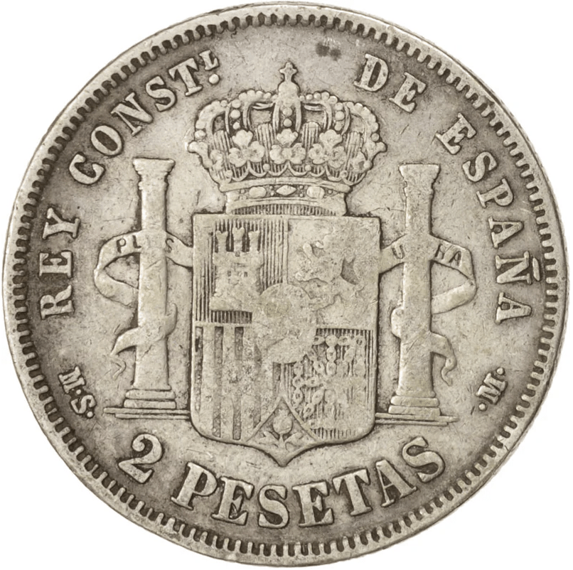 Pays : Espagne Poids brut : 10 g Poids fin : 8,35 g Titre : 835/1000 Ø : 10 mm Valeur faciale : 2 Pesetas Effigie : Alphonse XII Etat courant ou usé