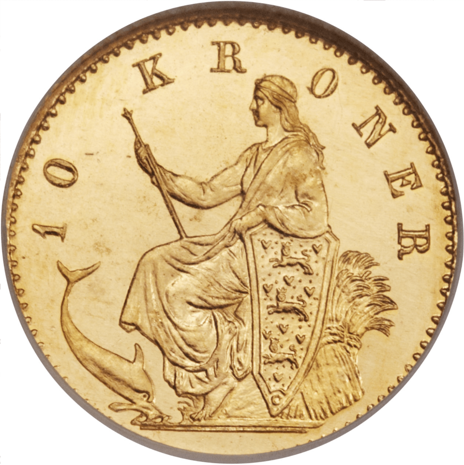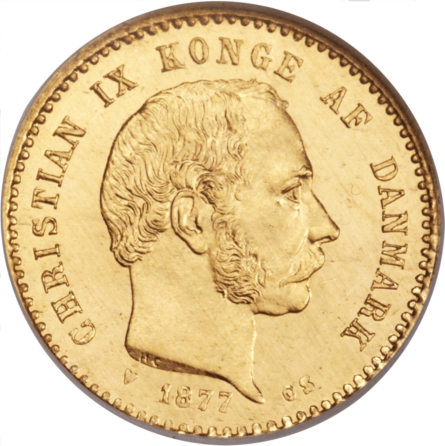 Années 1877 Pays : Danemark Poids brut : 4,48 g Poids fin : 4,03 g Titre : 900/1000 Diamètre : 18,5 mm Valeur faciale : 10 Kroner Effigie : Christian IX