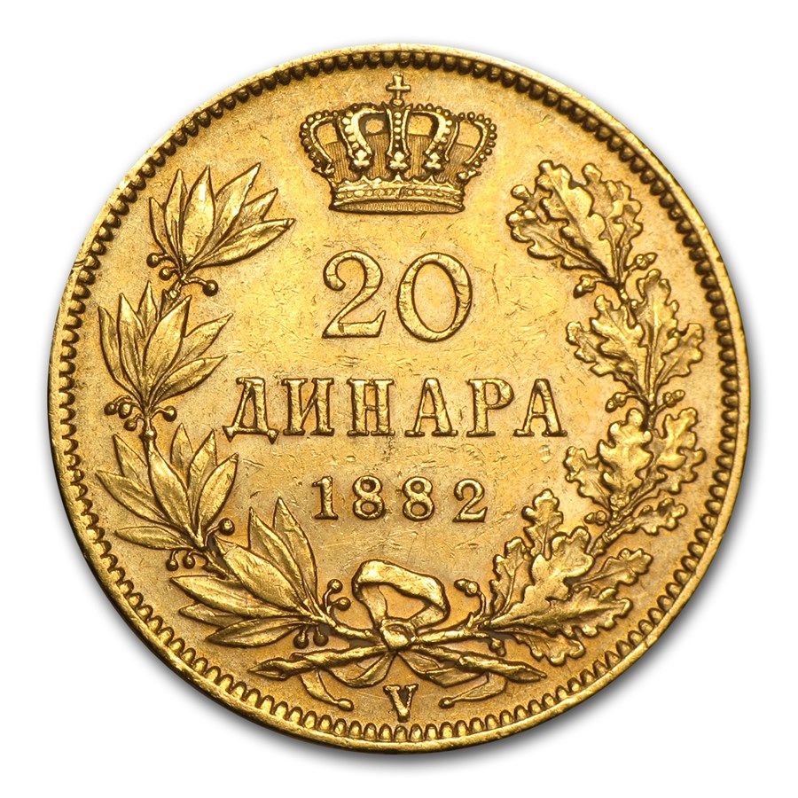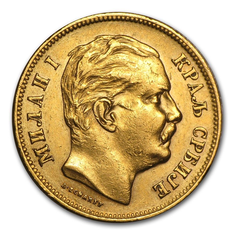Pays : Serbie Poids brut : 6,45 g Poids fin : 5,80 g Titre : 900/1000 Ø : 21 mm Valeur faciale : 20 dinars – 20 ДИНАРА Effigie : Milan I Etat : TTB+ min