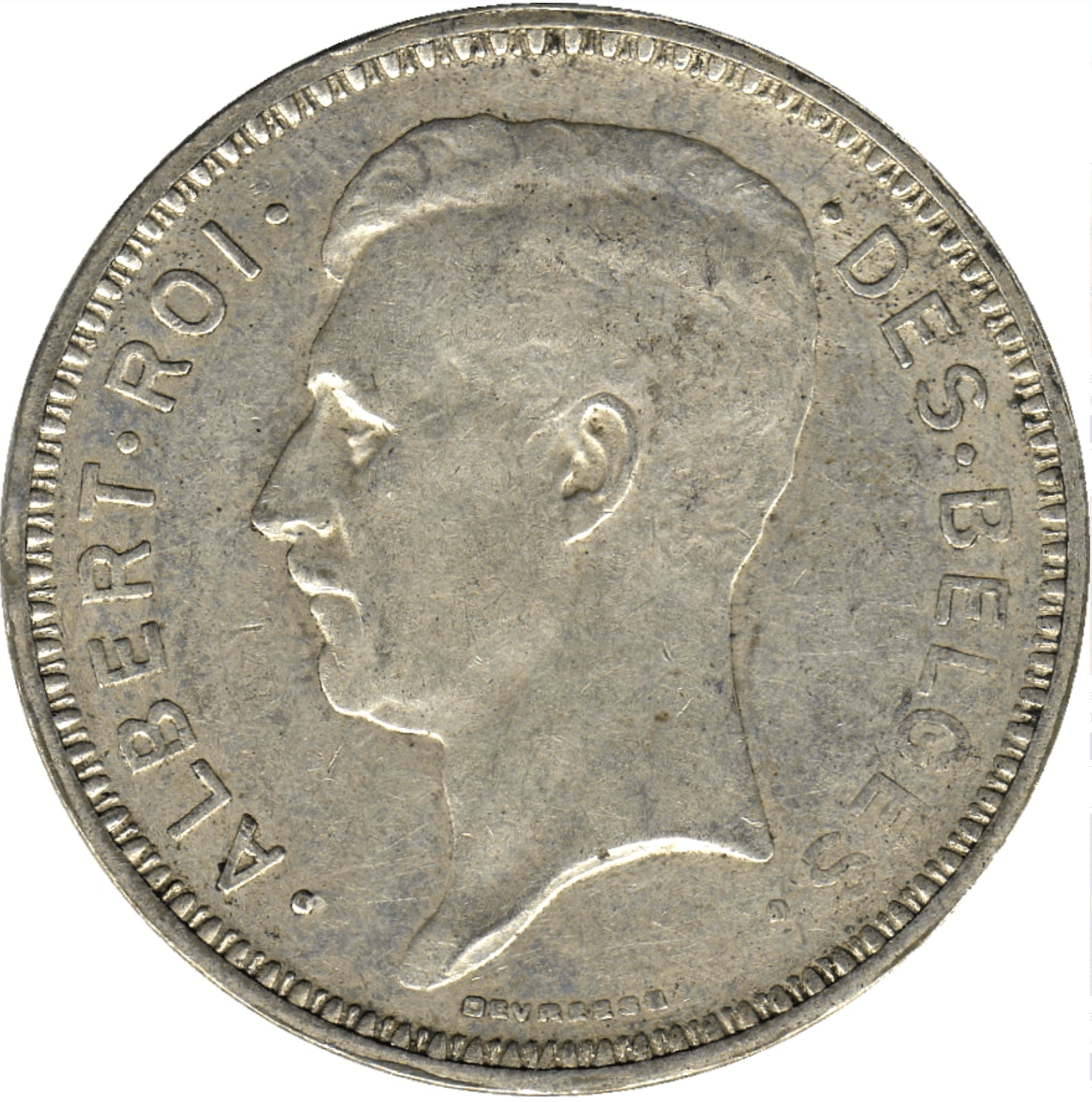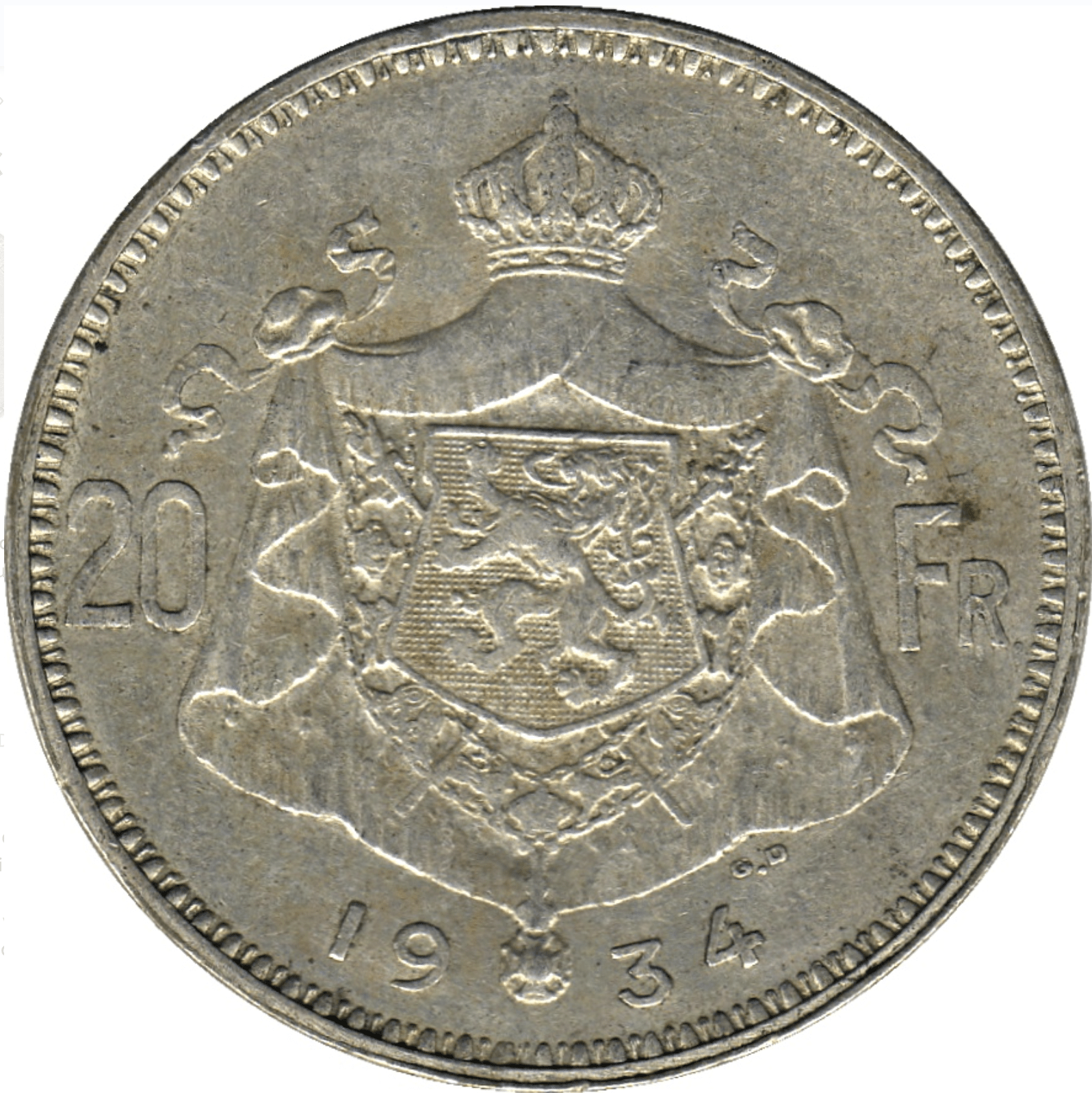 Pays : Belgique Poids brut : 11 g Poids fin : 7,48 g Titre : 680/1000 Ø : 28 mm Valeur faciale : 20 francs Effigie : Albert, Roi des Belges Etat courant Ecriture en Français ou en Be