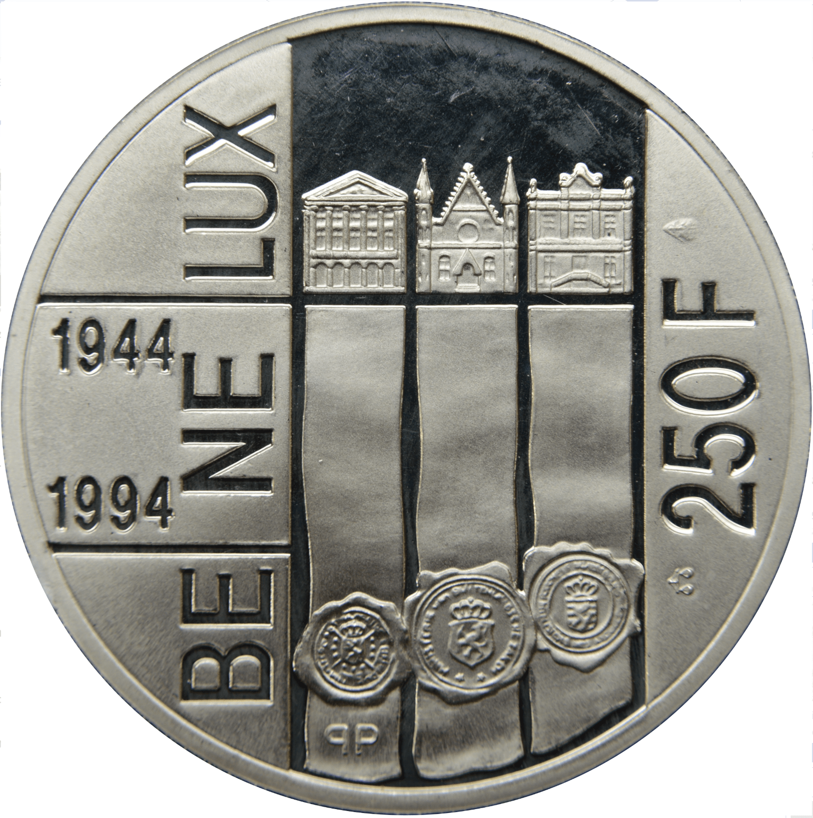 Pays : Belgique Poids brut : 18,75 g Poids fin : 17,35 g Titre : 925/1000 Ø : 33 mm Valeur faciale : 250 francs Effigie : Albert II 50 ans du Benelux Traces de circulation