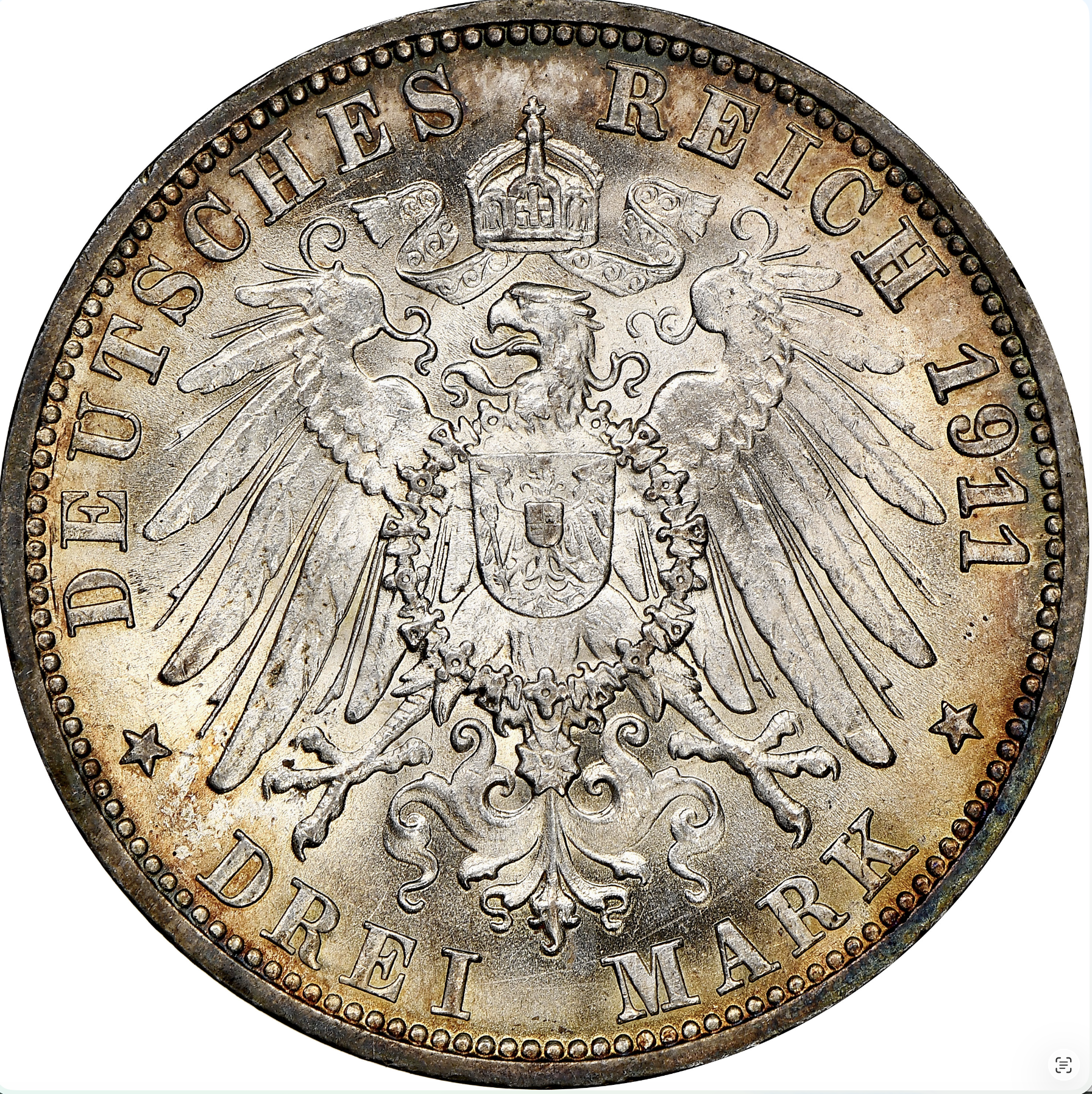 Pays : Allemagne Poids brut : 16,67 g Poids fin : 15 g Titre : 900/1000 Ø : 33 mm Valeur faciale : 3 Mark Effigie : wilhelm II et charlotte 1911