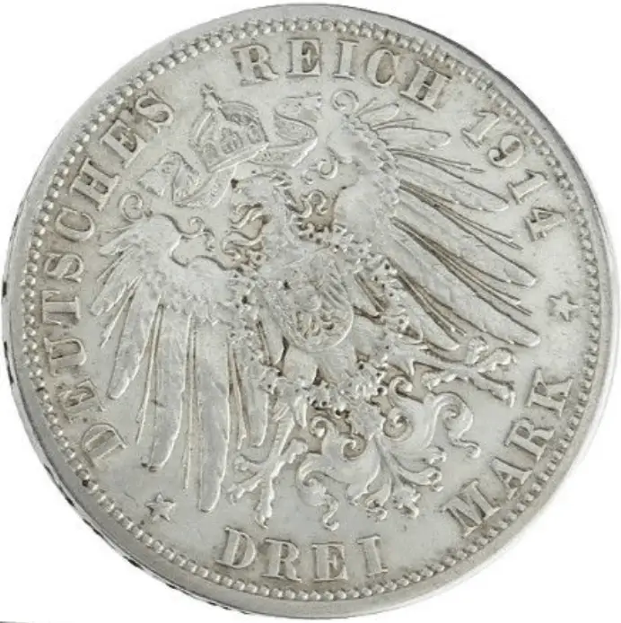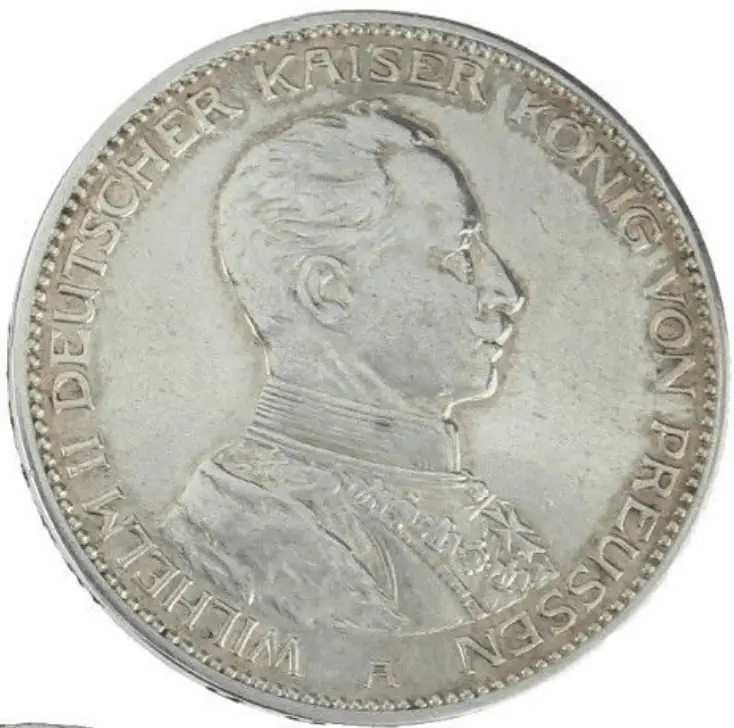 Pays : Allemagne Poids brut : 16,67 g Poids fin : 15 g Titre : 900/1000 Ø : 33 mm Valeur faciale : 3 Mark Effigies : wilhelm ii uniforme