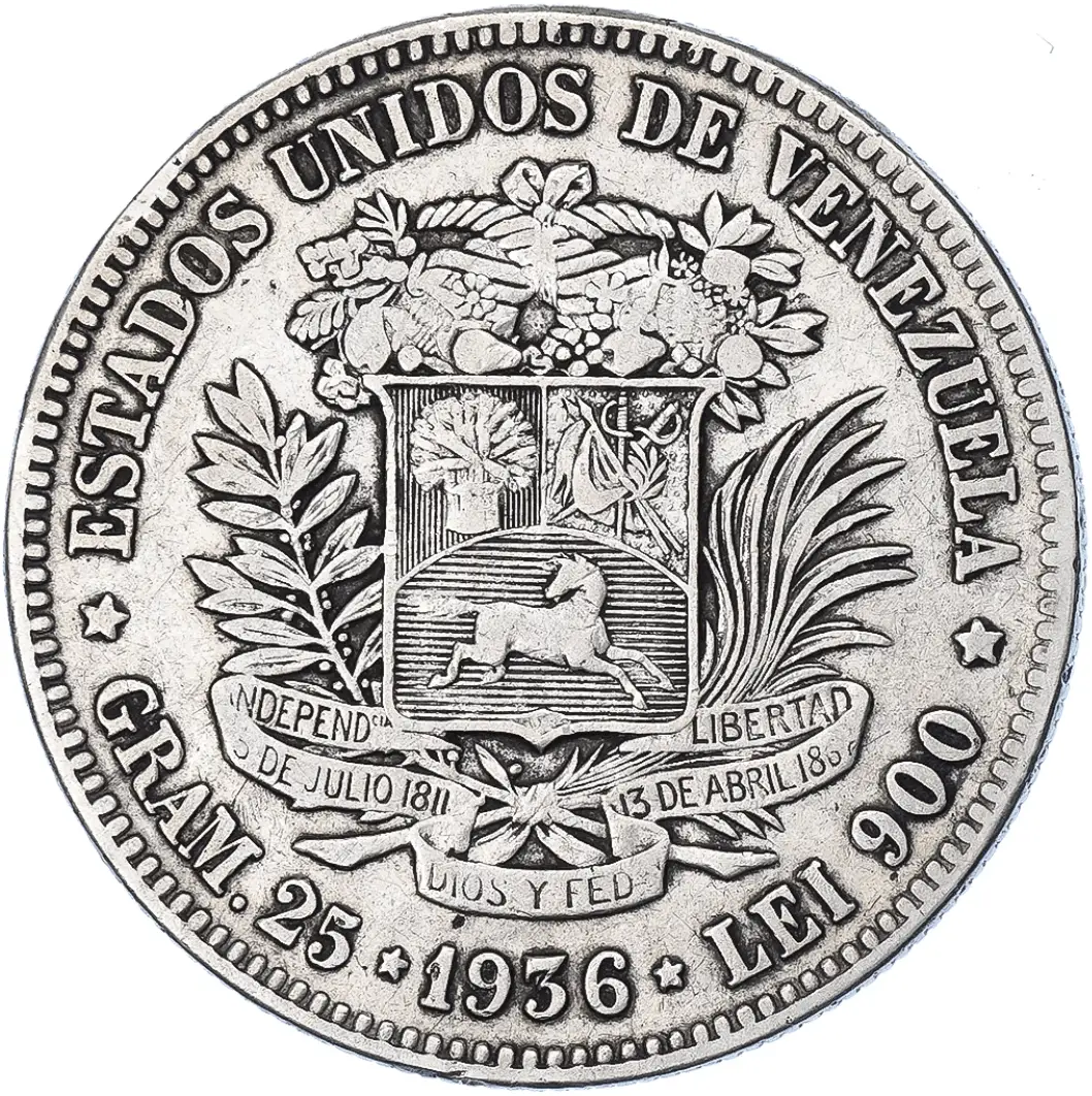 Pays : Venezuela Poids brut : 25 g Poids fin : 22,5 g Titre : 900/1000 Ø : 37,2 mm Valeur faciale : 5 Bolivares Effigie : Simón Bolívar Graveur : Désiré-Albert Barre Etat courant ou usé