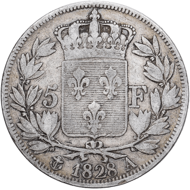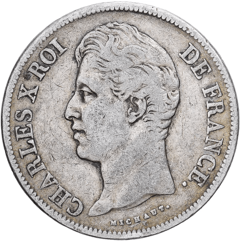 Pays : France Poids brut : 25 g Poids fin : 22,5 g Titre : 900/1000 Ø : 37 mm Valeur faciale : 5 francs Effigie : Charles X Etat courant ou usé