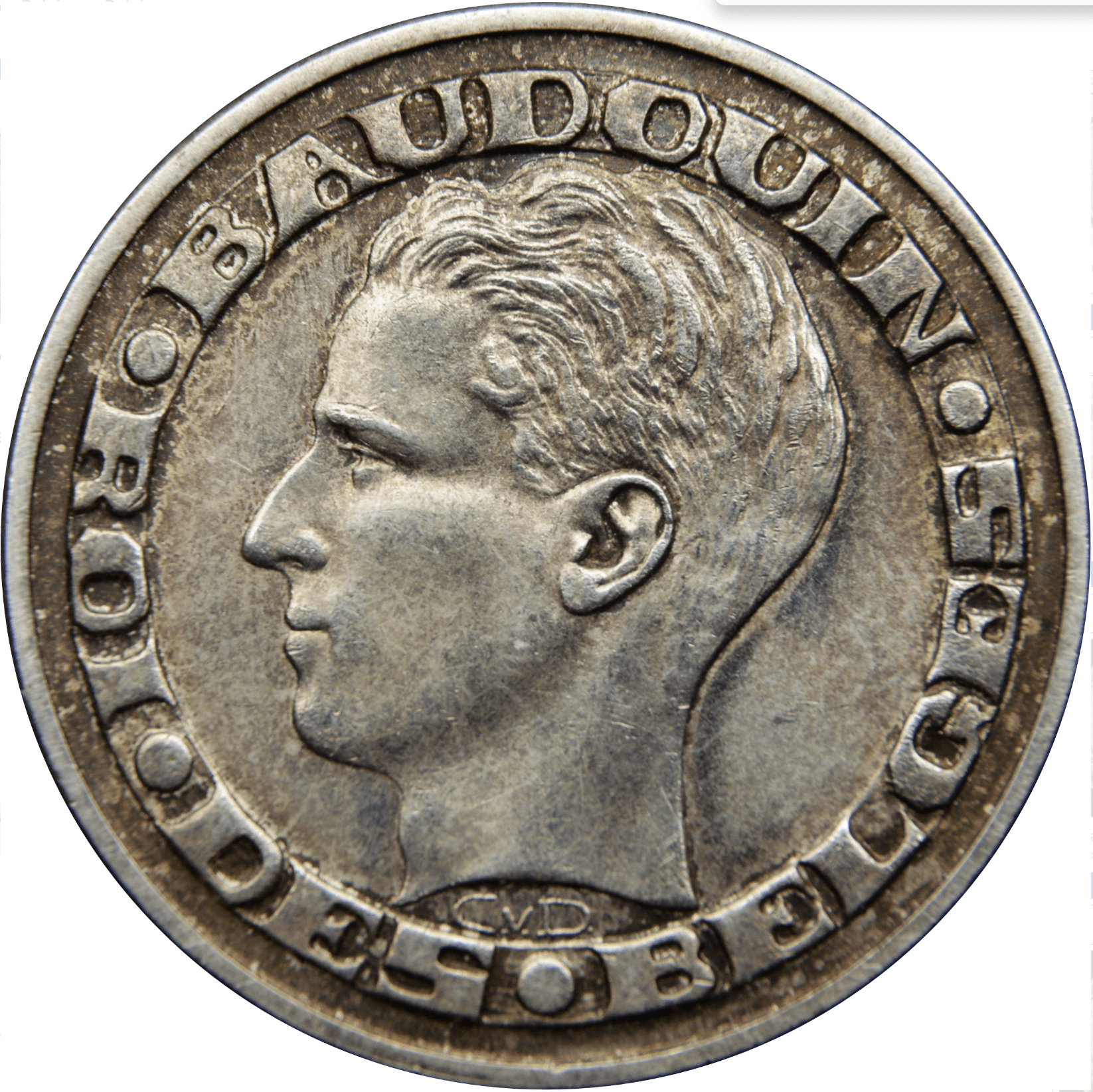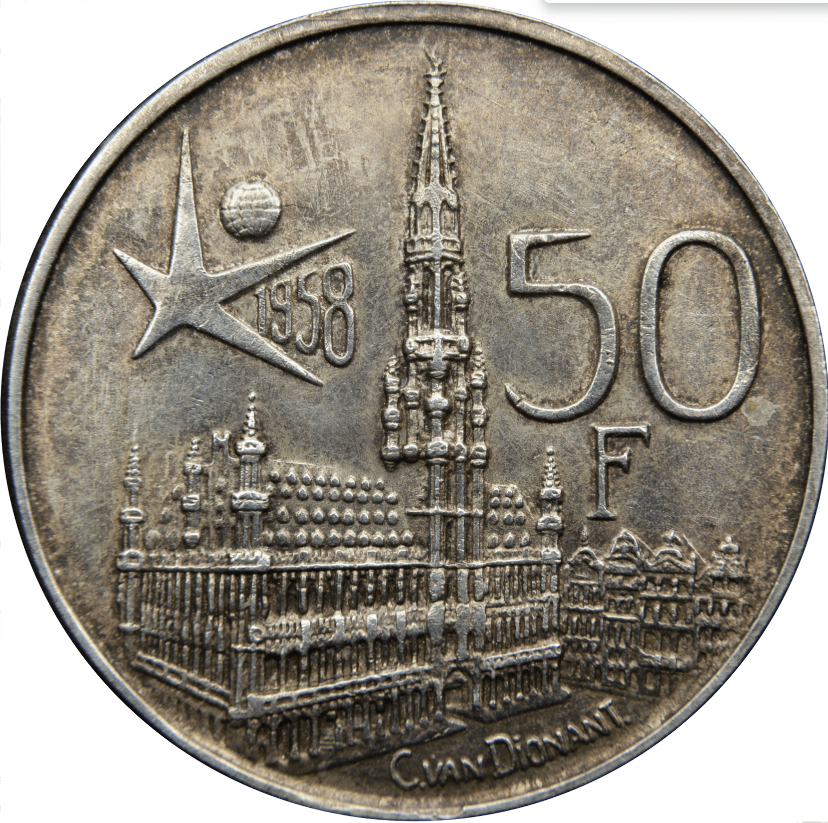 Revers : Hôtel de ville de Bruxelles et 4 maisons à sa droite, surmonté, à gauche de la tour, du logo de Exposition universelle de 1958 et, à droite, de la valeur nominale. Signature du graveur au bas de l’Hôtel de ville.