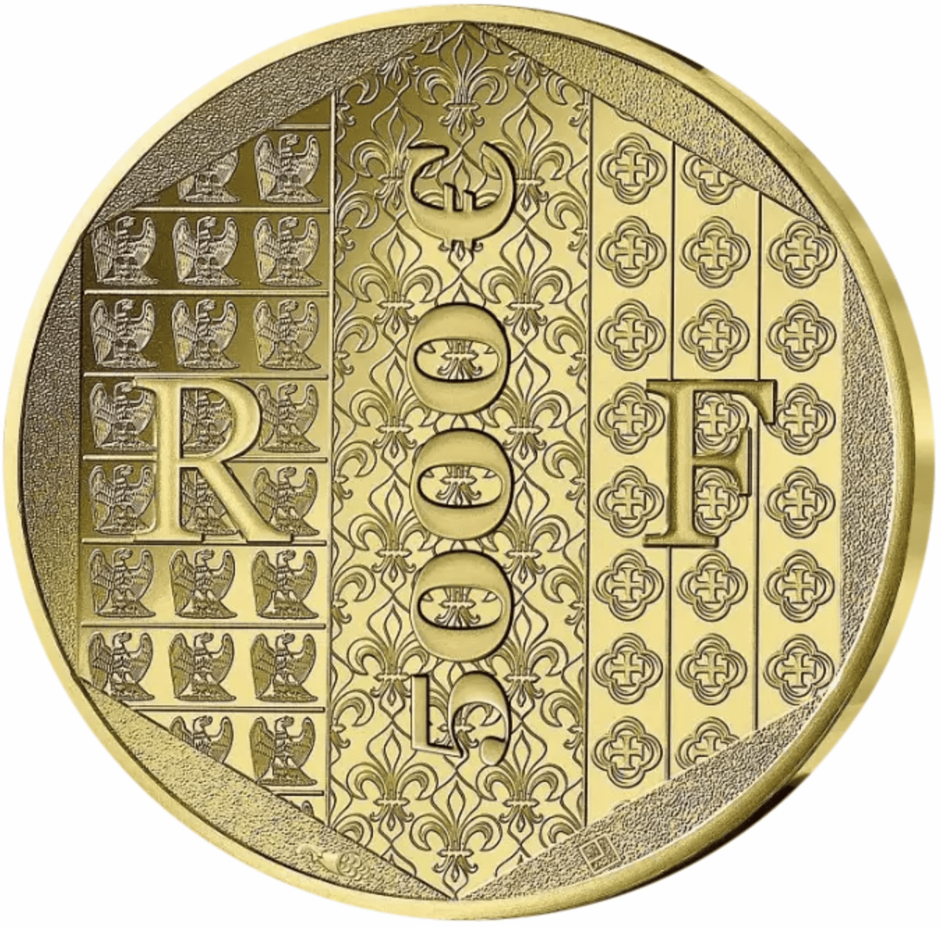 Monnaie de Paris Poids brut : 40 g Poids fin : 40 g Titre : 999/1000 Ø : 45 mm Valeur faciale : 5000 Euros Etat : BU Série Ors de France, le Franc à Cheval