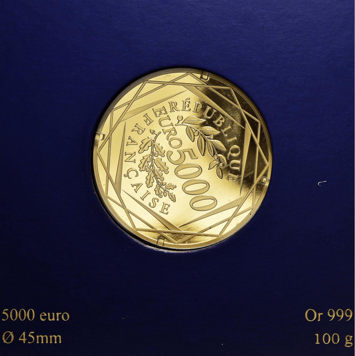 Monnaie de Paris Poids brut : 100 g Poids fin : 100 g Titre : 999/1000 Ø : 45 mm Valeur faciale : 5000 Euros Etat : BE Effigie : le coq