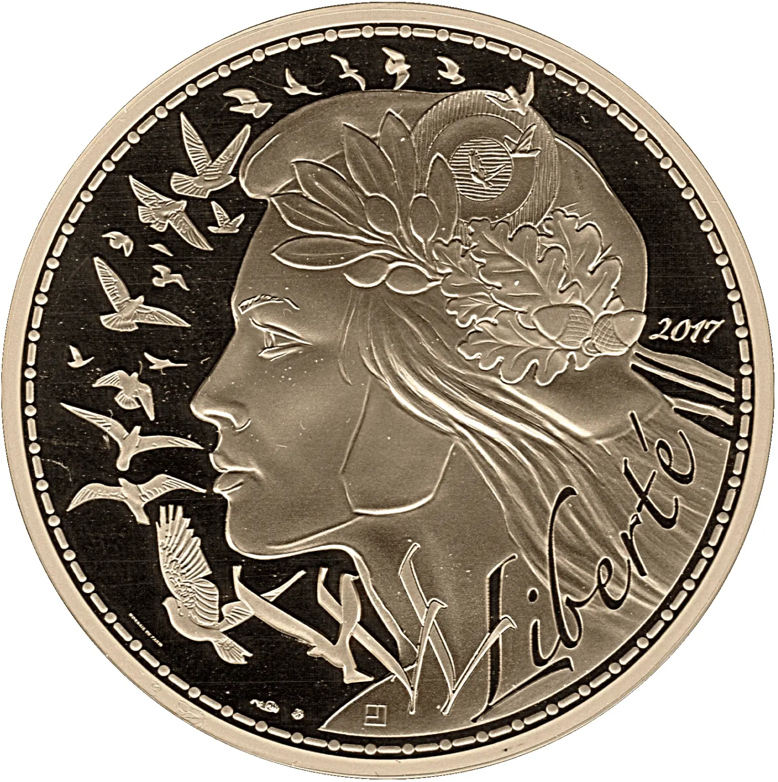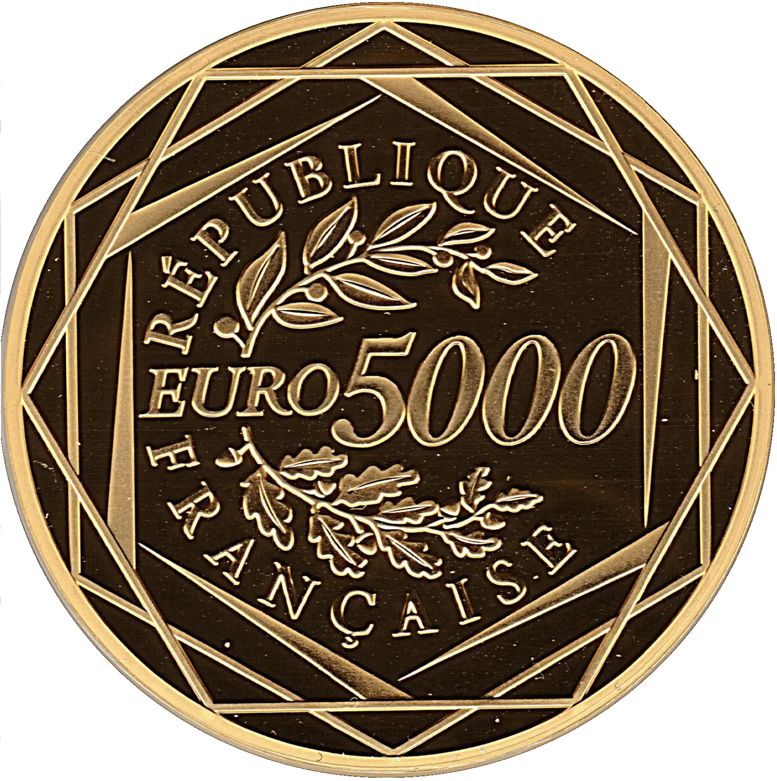 Monnaie de Paris Poids brut : 85 g Poids fin : 85 g Titre : 999/1000 Ø : 45 mm Valeur faciale : 5000 Euros Etat : BE Effigie : Marianne – Liberté Sous coffret, avec certificat