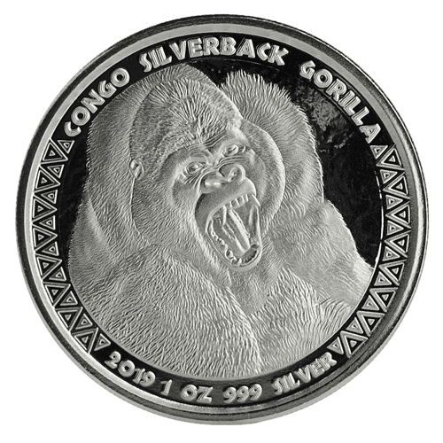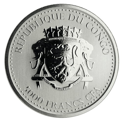Pays : Congo Poids brut : 31,1 g Poids fin : 31,1 g Titre : 999/1000 Ø : 38,6 mm Valeur faciale : 5000 Francs CFA Effigie : Gorille silverback