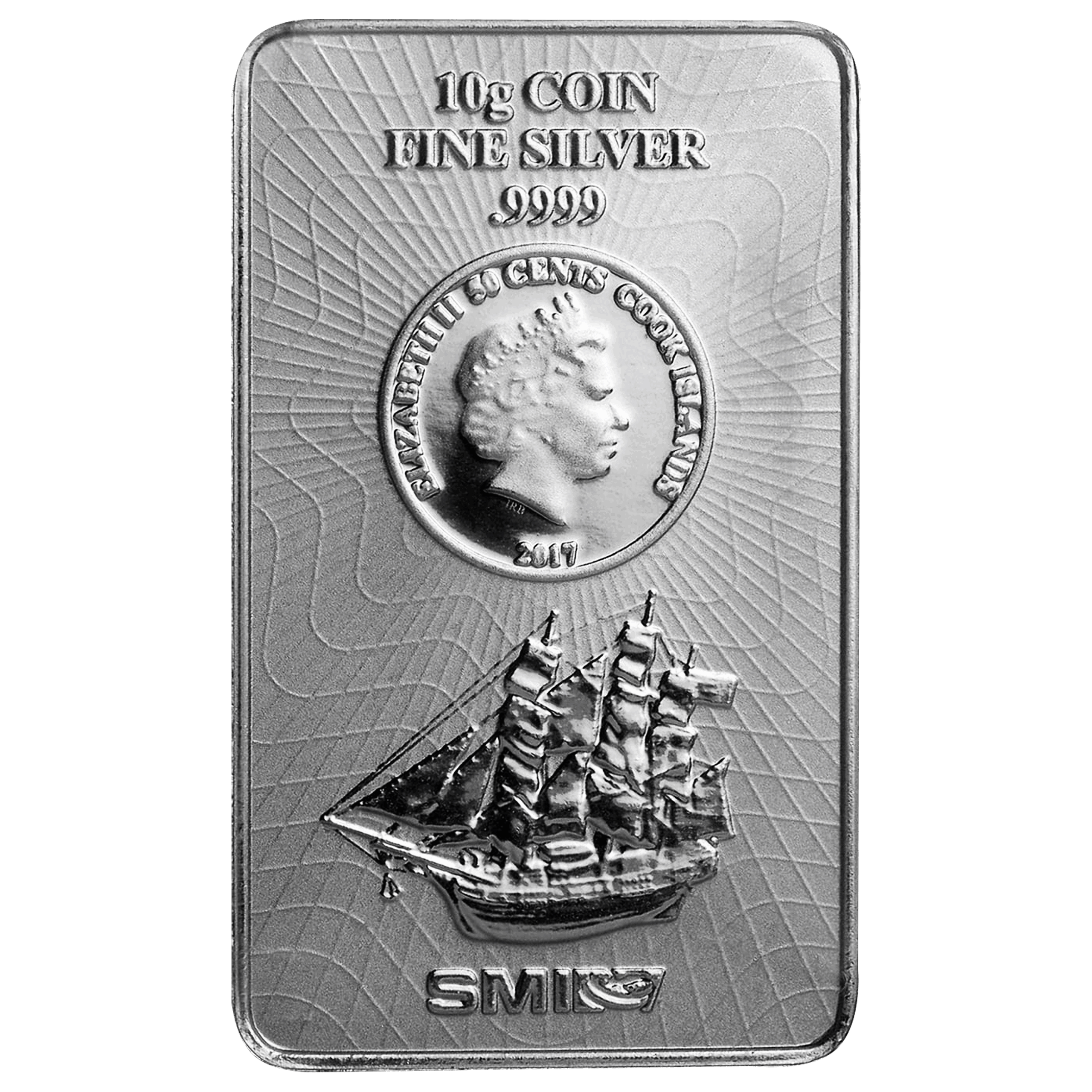 Métal : argent Année 2017 Pays : Cook Islands Emetteur : Sunshine Mint, Inc., USA Poids brut : 10 g Poids fin : 10 g Titre : 999,9/1000 Valeur faciale : 0,50$ CID Dimensions : 25,6 x 15,4 x 2,7 mm