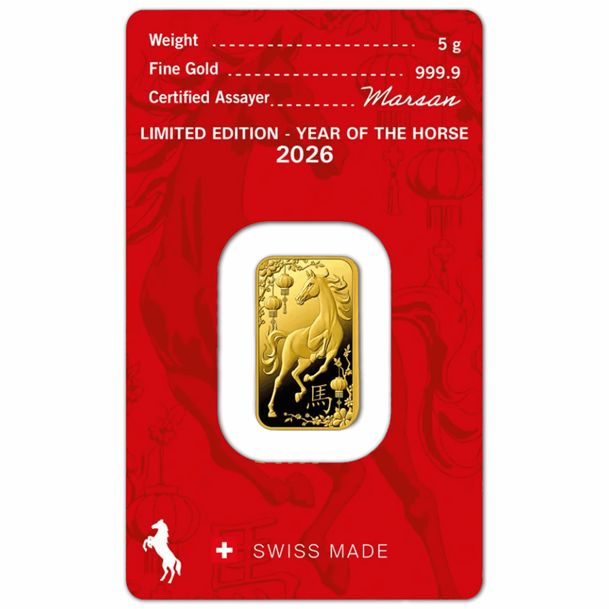 Métal : or Poids : 5 g Titre : 999,9/1000 Marque : Argor Heraeus Pays : Suisse 2026, l’année du cheval